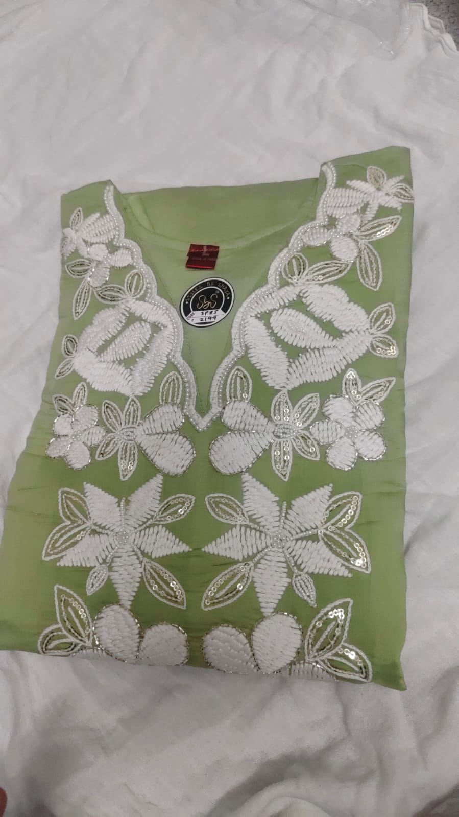Top (Kurta/Kameez): The elegant Roman Silk top is the canvas for delicate Hand Work (often featuring elements like Zari, Dabka, or beadwork) primarily focused on the neckline and yoke. This traditional hand-finishing adds a dimension of luxury and craftsmanship that no machine can replicate.